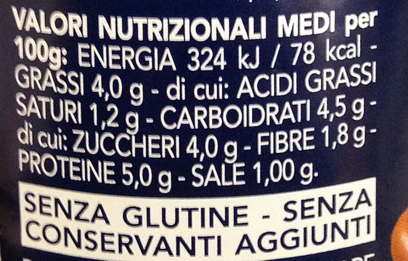 Barcode EAN:   8076809513326 Energy kcal/100g:   78 Satured Fat (per 100g)g:   1.2 Sugar into Carbohydrates (per 100g)g:   4 Proteines (per 100g)g:   5 Calcium CA/ mg (per 100g)g:   Gluten:   Production type:   Made in:   Italy Price €:   Bought here:   Last update:   2016-10-24 17:26:17 | Brand:   Fat (per 100g)g:   4 Carbohydrates (per 100g)g:   4.5 Fiber (per 100g)g:   1.8 Salt - Sodium (per 100g)g:   1 Ingredients (Indicative):   |