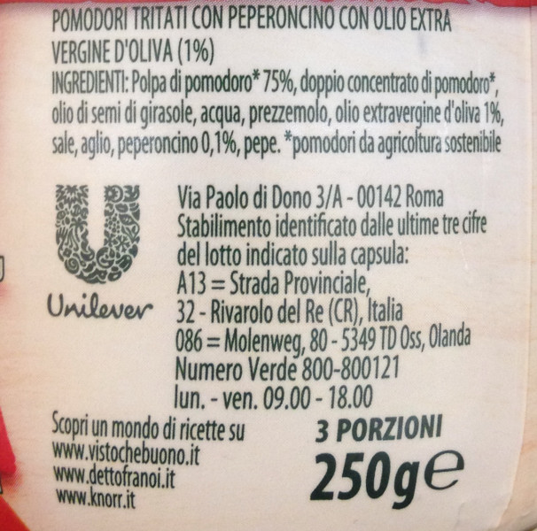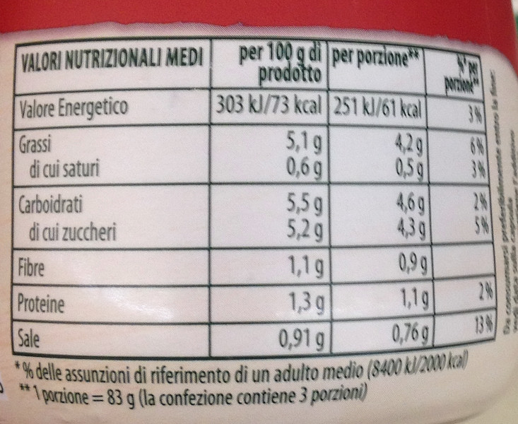Barcode EAN:   8000830300105 Energy kcal/100g:   73 Satured Fat (per 100g)g:   0.6 Sugar into Carbohydrates (per 100g)g:   5.2 Proteines (per 100g)g:   1.3 Calcium CA/ mg (per 100g)g:   Gluten:   Production type:   Made in:   Italy Price €:   Bought here:   Last update:   2016-10-24 19:45:21 | Brand:   Fat (per 100g)g:   5.1 Carbohydrates (per 100g)g:   5.5 Fiber (per 100g)g:   1.1 Salt - Sodium (per 100g)g:   0.91 Ingredients (Indicative):   |