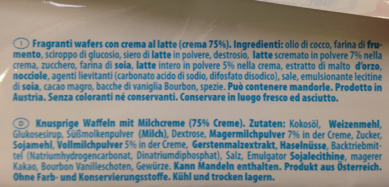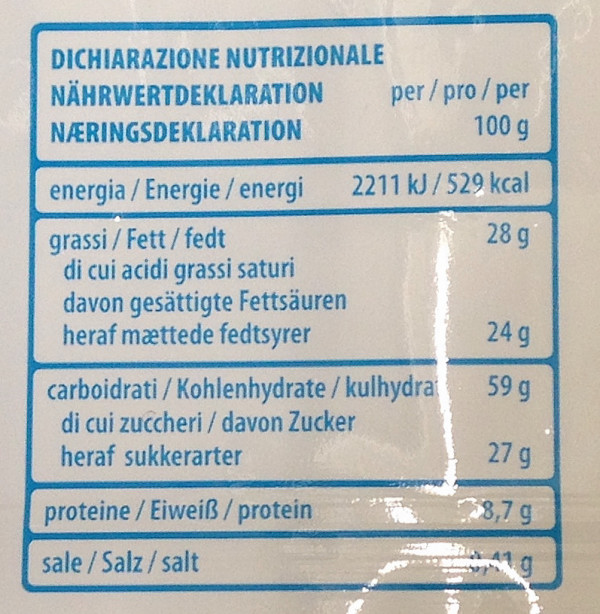 Barcode EAN:   8000380007271 Energy kcal/100g:   529 Satured Fat (per 100g)g:   24 Sugar into Carbohydrates (per 100g)g:   27 Proteines (per 100g)g:   8.7 Calcium CA/ mg (per 100g)g:   Gluten:   Production type:   Made in:   Austria Price €:   Bought here:   Last update:   2016-10-26 18:45:33 | Brand:   Fat (per 100g)g:   28 Carbohydrates (per 100g)g:   59 Fiber (per 100g)g:   Salt - Sodium (per 100g)g:   0.41 Ingredients (Indicative):   |