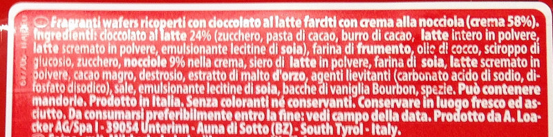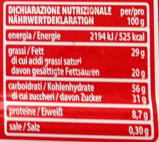 Barcode EAN:   8000380007288 Energy kcal/100g:   525 Satured Fat (per 100g)g:   20 Sugar into Carbohydrates (per 100g)g:   31 Proteines (per 100g)g:   8.7 Calcium CA/ mg (per 100g)g:   Gluten:   Production type:   Made in:   Italy Price €:   Bought here:   Last update:   2016-10-26 21:19:34 | Brand:   Fat (per 100g)g:   29 Carbohydrates (per 100g)g:   56 Fiber (per 100g)g:   Salt - Sodium (per 100g)g:   0.3 Ingredients (Indicative):   |