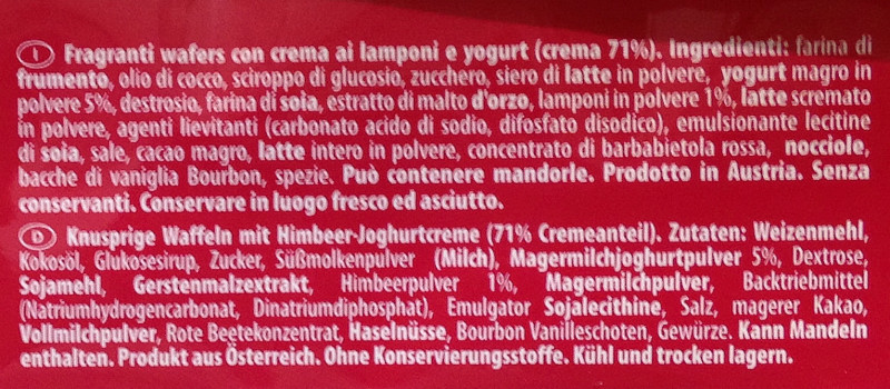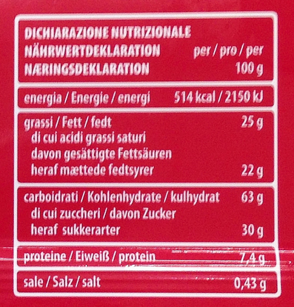 Barcode EAN:   8000380158270 Energy kcal/100g:   514 Satured Fat (per 100g)g:   22 Sugar into Carbohydrates (per 100g)g:   30 Proteines (per 100g)g:   7.4 Calcium CA/ mg (per 100g)g:   Gluten:   Production type:   Made in:   Austria Price €:   Bought here:   Last update:   2016-10-27 15:34:17 | Brand:   Fat (per 100g)g:   25 Carbohydrates (per 100g)g:   63 Fiber (per 100g)g:   Salt - Sodium (per 100g)g:   0.43 Ingredients (Indicative):   |