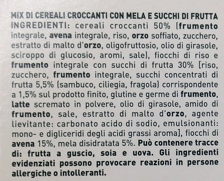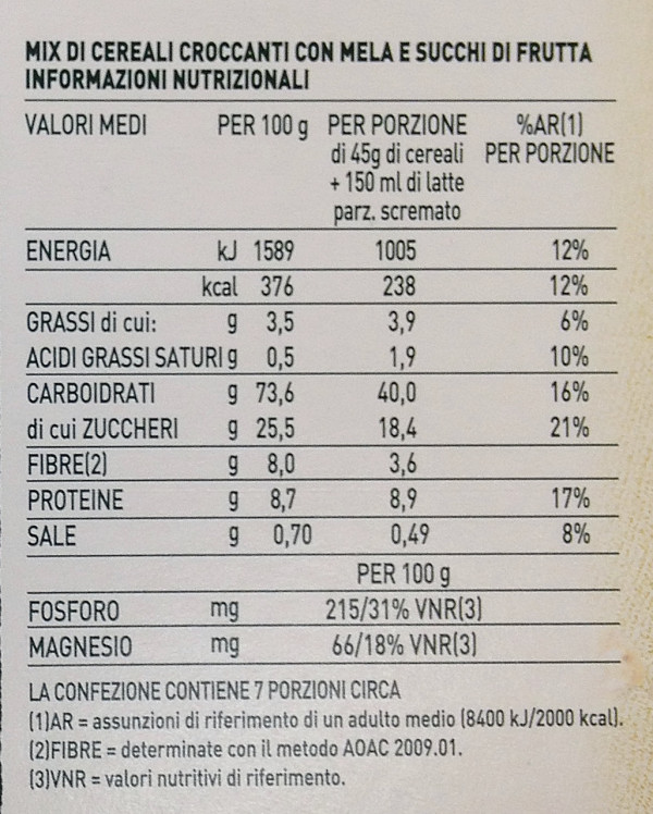 Barcode EAN:   8076809568982 Energy kcal/100g:   376 Satured Fat (per 100g)g:   0.5 Sugar into Carbohydrates (per 100g)g:   25.5 Proteines (per 100g)g:   8.7 Calcium CA/ mg (per 100g)g:   Gluten:   Production type:   Made in:   Italy Price €:   Bought here:   Last update:   2016-11-02 14:31:36 | Brand:   Fat (per 100g)g:   3.5 Carbohydrates (per 100g)g:   73.6 Fiber (per 100g)g:   8 Salt - Sodium (per 100g)g:   0.7 Ingredients (Indicative):   |