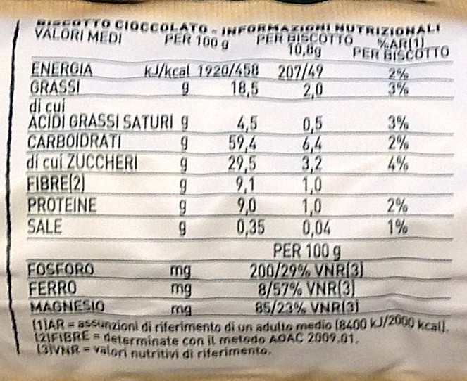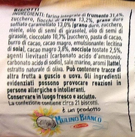 Barcode EAN:   8076809522533 Energy kcal/100g:   458 Satured Fat (per 100g)g:   4.5 Sugar into Carbohydrates (per 100g)g:   29.5 Proteines (per 100g)g:   9 Calcium CA/ mg (per 100g)g:   Gluten:   Production type:   Made in:   Italy Price €:   Bought here:   Last update:   2016-11-15 19:58:16 | Brand:   Fat (per 100g)g:   18.5 Carbohydrates (per 100g)g:   59.4 Fiber (per 100g)g:   9.1 Salt - Sodium (per 100g)g:   0.35 Ingredients (Indicative):   |