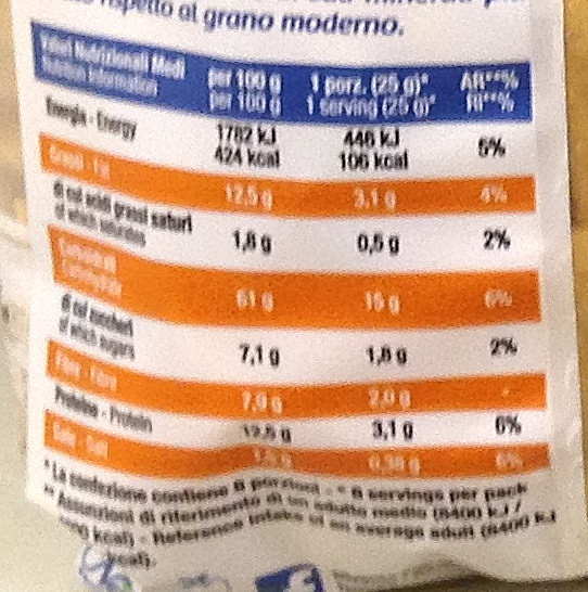 Barcode EAN:   8000003056488 Energy kcal/100g:   424 Satured Fat (per 100g)g:   1.8 Sugar into Carbohydrates (per 100g)g:   7.1 Proteines (per 100g)g:   12.5 Calcium CA/ mg (per 100g)g:   Gluten:   Production type:   Made in:   Italy Price €:   Last update:   2016-12-27 19:08:21 | Brand:   Fat (per 100g)g:   12.5 Carbohydrates (per 100g)g:   61 Fiber (per 100g)g:   7.9 Salt - Sodium (per 100g)g:   1.53 Ingredients (Indicative):   Bought here:   |