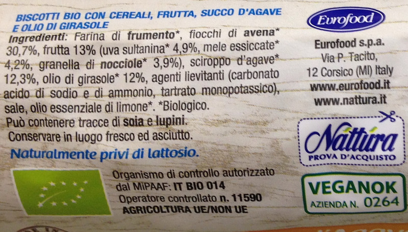Farina di frumento*, fiocchi di avena*30,7%, frutta 13% (uva sultanina* 4,9%, mele essiccate*4,2%, granella di nocciole* 3,9%), sciroppo d’agave*12,3%, olio di girasole* 12%, agenti lievitanti (carbonato acido di sodio e di ammonio, tartrato monopotassico), sale, olio essenziale di limone*. *Biologico.