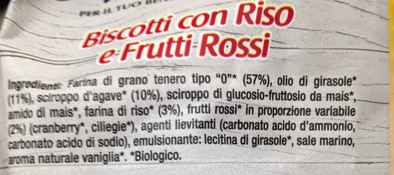 Barcode EAN:   8000003057102 Energy kcal/100g:   456 Satured Fat (per 100g)g:   1.6 Sugar into Carbohydrates (per 100g)g:   20 Proteines (per 100g)g:   8.1 Calcium CA/ mg (per 100g)g:   Gluten:   Production type:   Made in:   Italy Price €:   Bought here:   Last update:   2019-03-31 12:39:50 | Brand:   Fat (per 100g)g:   14 Carbohydrates (per 100g)g:   74 Fiber (per 100g)g:   2.1 Salt - Sodium (per 100g)g:   0.5 Ingredients (Indicative):   |