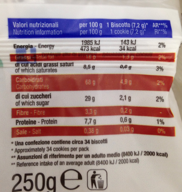 Barcode EAN:   8000003056860 Energy kcal/100g:   473 Satured Fat (per 100g)g:   8.6 Sugar into Carbohydrates (per 100g)g:   29 Proteines (per 100g)g:   7.7 Calcium CA/ mg (per 100g)g:   Gluten:   Production type:   Made in:   Italy Price €:   Bought here:   Last update:   2025-12-03 15:08:45 | Brand:   Fat (per 100g)g:   18 Carbohydrates (per 100g)g:   68 Fiber (per 100g)g:   3.3 Salt - Sodium (per 100g)g:   0.38 Ingredients (Indicative):   |