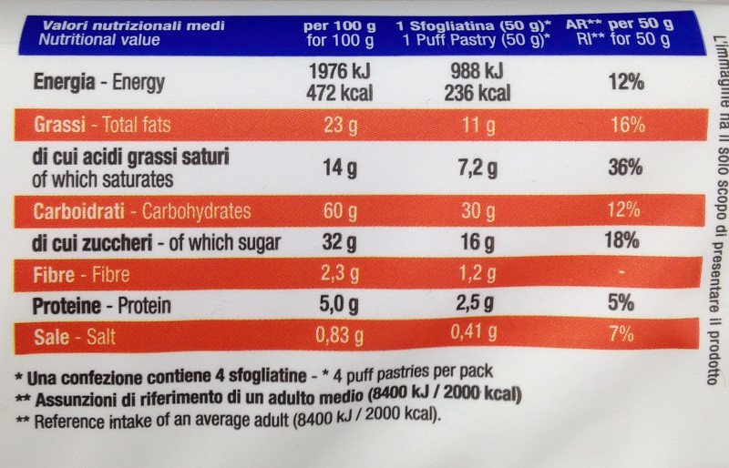 Barcode EAN:   8000003059670 Energy kcal/100g:   472 Satured Fat (per 100g)g:   14 Sugar into Carbohydrates (per 100g)g:   32 Proteines (per 100g)g:   5 Calcium CA/ mg (per 100g)g:   Gluten:   Production type:   Made in:   Italy Price €:   Bought here:   Last update:   2016-12-29 16:07:11 | Brand:   Fat (per 100g)g:   23 Carbohydrates (per 100g)g:   60 Fiber (per 100g)g:   2.3 Salt - Sodium (per 100g)g:   0.83 Ingredients (Indicative):   |
