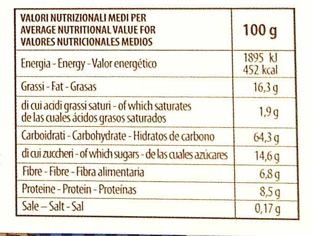 Barcode EAN:   8002885006964 Energy kcal/100g:   452 Satured Fat (per 100g)g:   1.9 Sugar into Carbohydrates (per 100g)g:   14.6 Proteines (per 100g)g:   8.5 Calcium CA/ mg (per 100g)g:   Gluten:   Production type:   Made in:   Italy Price €:   Bought here:   Last update:   2016-12-29 19:26:34 | Brand:   Fat (per 100g)g:   16.3 Carbohydrates (per 100g)g:   64.3 Fiber (per 100g)g:   6.8 Salt - Sodium (per 100g)g:   0.17 Ingredients (Indicative):   |