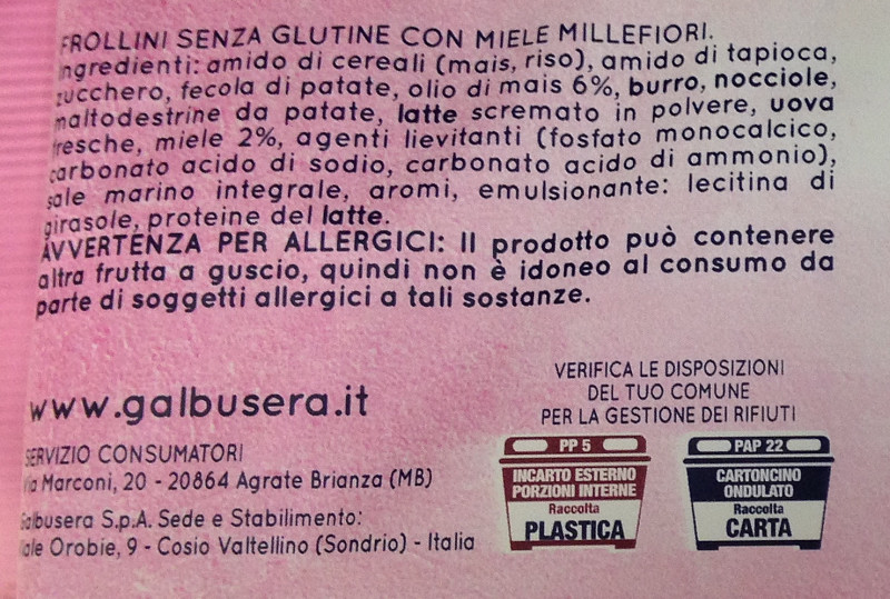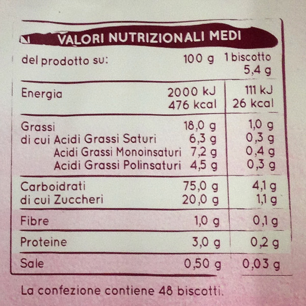 Barcode EAN:   8002190001791 Energy kcal/100g:   476 Satured Fat (per 100g)g:   6.3 Sugar into Carbohydrates (per 100g)g:   20 Proteines (per 100g)g:   3 Calcium CA/ mg (per 100g)g:   Gluten:   Production type:   Made in:   Italy Price €:   Bought here:   Last update:   2016-12-30 17:49:53 | Brand:   Fat (per 100g)g:   18 Carbohydrates (per 100g)g:   75 Fiber (per 100g)g:   1 Salt - Sodium (per 100g)g:   0.5 Ingredients (Indicative):   |