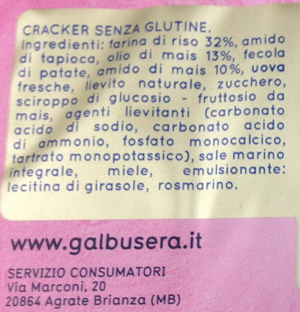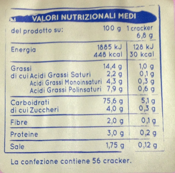Barcode EAN:   8002190002637 Energy kcal/100g:   448 Satured Fat (per 100g)g:   2.2 Sugar into Carbohydrates (per 100g)g:   4 Proteines (per 100g)g:   3 Calcium CA/ mg (per 100g)g:   Gluten:   Production type:   Made in:   Italy Price €:   Bought here:   Last update:   2016-12-30 20:02:42 | Brand:   Fat (per 100g)g:   14.4 Carbohydrates (per 100g)g:   75.6 Fiber (per 100g)g:   2 Salt - Sodium (per 100g)g:   1.75 Ingredients (Indicative):   |