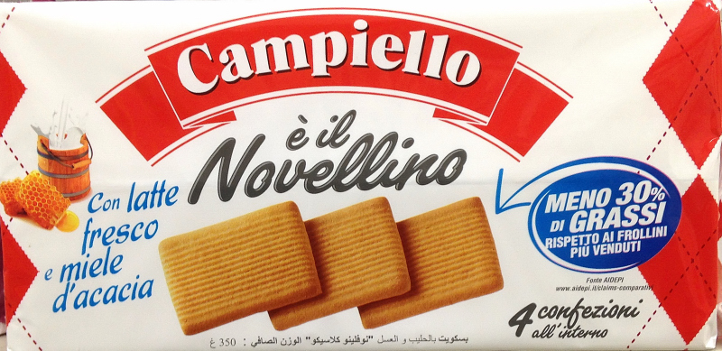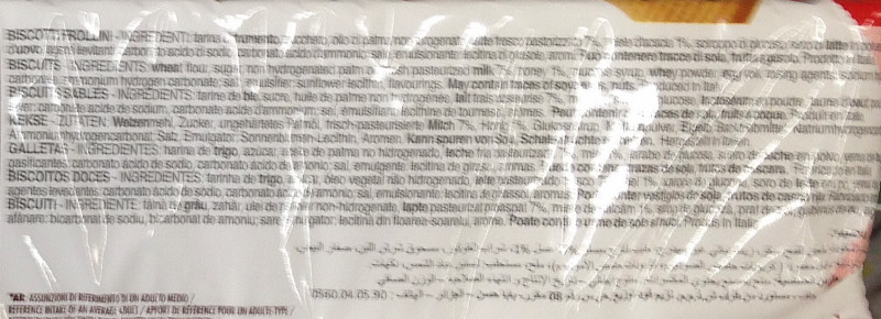 Barcode EAN:   8000590211062 Energy kcal/100g:   443 Satured Fat (per 100g)g:   5.6 Sugar into Carbohydrates (per 100g)g:   27 Proteines (per 100g)g:   6.5 Calcium CA/ mg (per 100g)g:   Gluten:   Production type:   Made in:   Italy Price €:   Bought here:   Last update:   2016-12-31 17:53:02 | Brand:   Fat (per 100g)g:   12 Carbohydrates (per 100g)g:   76 Fiber (per 100g)g:   2.5 Salt - Sodium (per 100g)g:   0.63 Ingredients (Indicative):   |