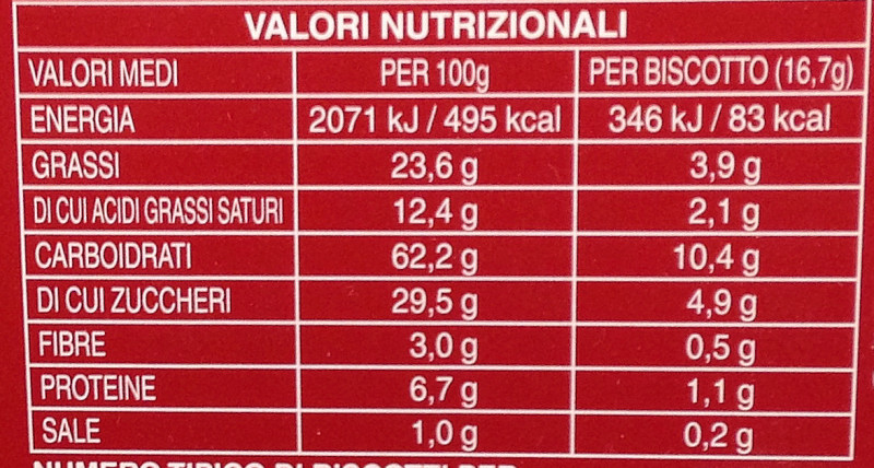Barcode EAN:   5000396025965 Energy kcal/100g:   495 Satured Fat (per 100g)g:   12.4 Sugar into Carbohydrates (per 100g)g:   29.5 Proteines (per 100g)g:   6.7 Calcium CA/ mg (per 100g)g:   Gluten:   Production type:   Made in:   United Kingdom Price €:   Bought here:   Last update:   2016-12-31 18:50:08 | Brand:   Fat (per 100g)g:   23.6 Carbohydrates (per 100g)g:   62.2 Fiber (per 100g)g:   3 Salt - Sodium (per 100g)g:   1 Ingredients (Indicative):   |