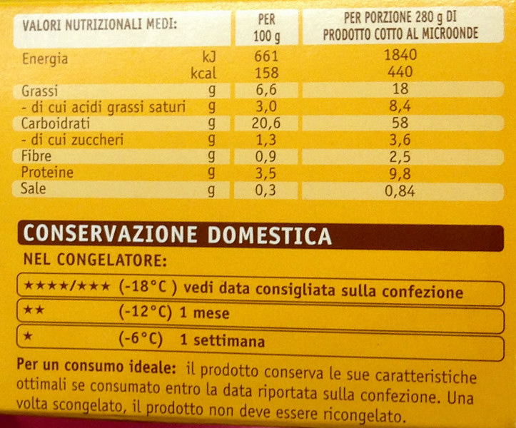 Barcode EAN:   8051084001843 Energy kcal/100g:   158 Satured Fat (per 100g)g:   3 Sugar into Carbohydrates (per 100g)g:   1.3 Proteines (per 100g)g:   3.5 Calcium CA/ mg (per 100g)g:   Gluten:   Production type:   Made in:   Italy Price €:   Bought here:   Last update:   2017-01-01 18:24:38 | Brand:   Fat (per 100g)g:   6.6 Carbohydrates (per 100g)g:   20.6 Fiber (per 100g)g:   0.9 Salt - Sodium (per 100g)g:   0.3 Ingredients (Indicative):   |