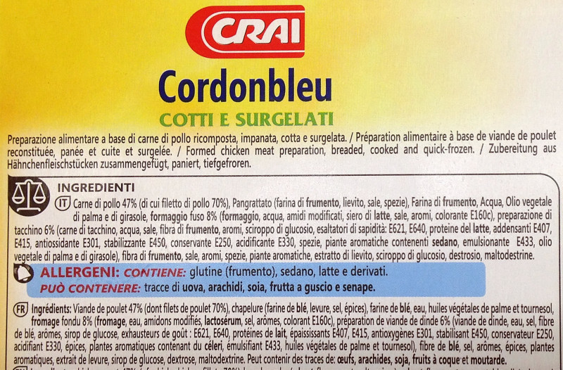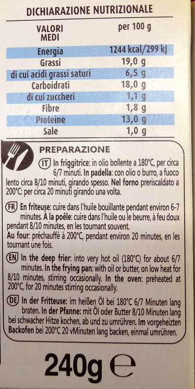 Barcode EAN:   8002895026358 Energy kcal/100g:   299 Satured Fat (per 100g)g:   6.5 Sugar into Carbohydrates (per 100g)g:   1.1 Proteines (per 100g)g:   13 Calcium CA/ mg (per 100g)g:   Gluten:   Production type:   Made in:   Italy Price €:   Bought here:   Last update:   2017-01-01 19:25:55 | Brand:   Fat (per 100g)g:   19 Carbohydrates (per 100g)g:   18 Fiber (per 100g)g:   1.8 Salt - Sodium (per 100g)g:   1 Ingredients (Indicative):   |