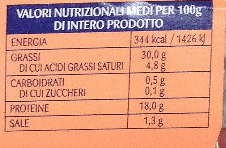 Barcode EAN:   8004030081024 Energy kcal/100g:   344 Satured Fat (per 100g)g:   4.8 Sugar into Carbohydrates (per 100g)g:   0.1 Proteines (per 100g)g:   18 Calcium CA/ mg (per 100g)g:   Gluten:   Production type:   Made in:   Italy Price €:   Bought here:   Last update:   2017-01-03 17:05:38 | Brand:   Fat (per 100g)g:   30 Carbohydrates (per 100g)g:   0.5 Fiber (per 100g)g:   Salt - Sodium (per 100g)g:   1.3 Ingredients (Indicative):   |