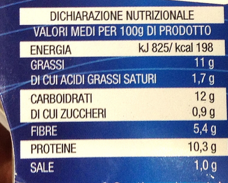 Barcode EAN:   8005960510325 Energy kcal/100g:   198 Satured Fat (per 100g)g:   1.7 Sugar into Carbohydrates (per 100g)g:   0.9 Proteines (per 100g)g:   10.3 Calcium CA/ mg (per 100g)g:   Gluten:   Production type:   Made in:   Italy Price €:   Bought here:   Last update:   2017-01-03 17:36:59 | Brand:   Fat (per 100g)g:   11 Carbohydrates (per 100g)g:   12 Fiber (per 100g)g:   5.4 Salt - Sodium (per 100g)g:   1 Ingredients (Indicative):   |