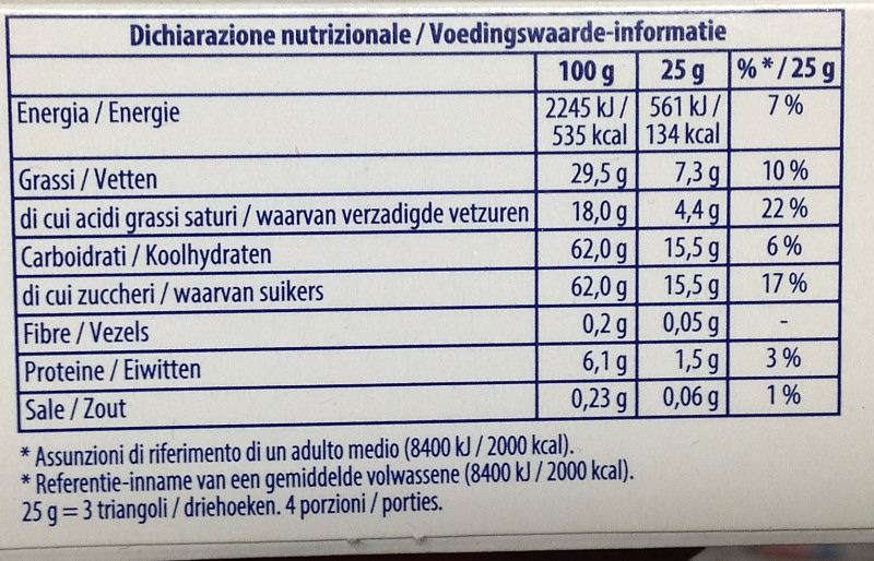 Barcode EAN:   7614500010310 Energy kcal/100g:   535 Satured Fat (per 100g)g:   18 Sugar into Carbohydrates (per 100g)g:   62 Proteines (per 100g)g:   6.1 Calcium CA/ mg (per 100g)g:   Gluten:   Production type:   Made in:   Switzerland Price €:   Bought here:   Last update:   2017-01-04 16:06:01 | Brand:   Fat (per 100g)g:   29.5 Carbohydrates (per 100g)g:   62 Fiber (per 100g)g:   0.2 Salt - Sodium (per 100g)g:   0.23 Ingredients (Indicative):   |