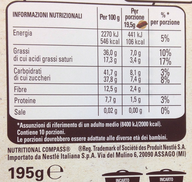 Barcode EAN:   7613034517999 Energy kcal/100g:   546 Satured Fat (per 100g)g:   17.3 Sugar into Carbohydrates (per 100g)g:   37.8 Proteines (per 100g)g:   7.7 Calcium CA/ mg (per 100g)g:   Gluten:   Production type:   Made in:   Price €:   Bought here:   Last update:   2017-01-05 17:49:16 | Brand:   Fat (per 100g)g:   36 Carbohydrates (per 100g)g:   41.7 Fiber (per 100g)g:   12.5 Salt - Sodium (per 100g)g:   0.02 Ingredients (Indicative):   |
