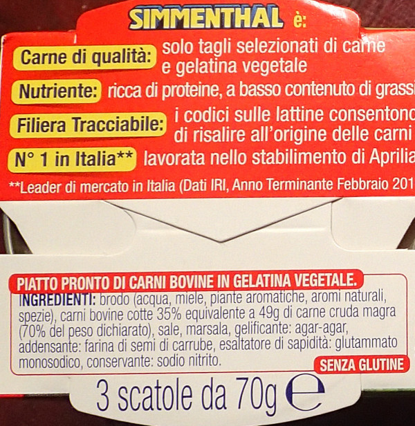 Barcode EAN:   8001070000015 Energy kcal/100g:   61 Satured Fat (per 100g)g:   0.7 Sugar into Carbohydrates (per 100g)g:   0.2 Proteines (per 100g)g:   11.5 Calcium CA/ mg (per 100g)g:   Gluten:   Production type:   Made in:   Italy Price €:   Bought here:   Last update:   2017-01-07 19:48:31 | Brand:   Fat (per 100g)g:   1.5 Carbohydrates (per 100g)g:   0.2 Fiber (per 100g)g:   0.5 Salt - Sodium (per 100g)g:   1.9 Ingredients (Indicative):   |