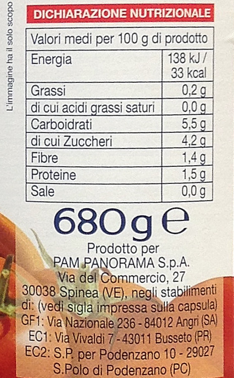 Barcode EAN:   8004263662694 Energy kcal/100g:   33 Satured Fat (per 100g)g:   Sugar into Carbohydrates (per 100g)g:   4.2 Proteines (per 100g)g:   1.5 Calcium CA/ mg (per 100g)g:   Gluten:   Production type:   Made in:   Italy Bought here:   Last update:   2017-01-08 12:57:20 | Brand:   Fat (per 100g)g:   0.2 Carbohydrates (per 100g)g:   5.5 Fiber (per 100g)g:   1.4 Salt - Sodium (per 100g)g:   Ingredients (Indicative):   Price €:   |