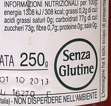 Barcode EAN:   8004190400505 Energy kcal/100g:   308 Satured Fat (per 100g)g:   Sugar into Carbohydrates (per 100g)g:   73 Proteines (per 100g)g:   Calcium CA/ mg (per 100g)g:   Gluten:   Production type:   Made in:   Italy Price €:   Bought here:   Last update:   2017-01-08 18:37:15 | Brand:   Fat (per 100g)g:   0.2 Carbohydrates (per 100g)g:   77 Fiber (per 100g)g:   0.7 Salt - Sodium (per 100g)g:   Ingredients (Indicative):   |