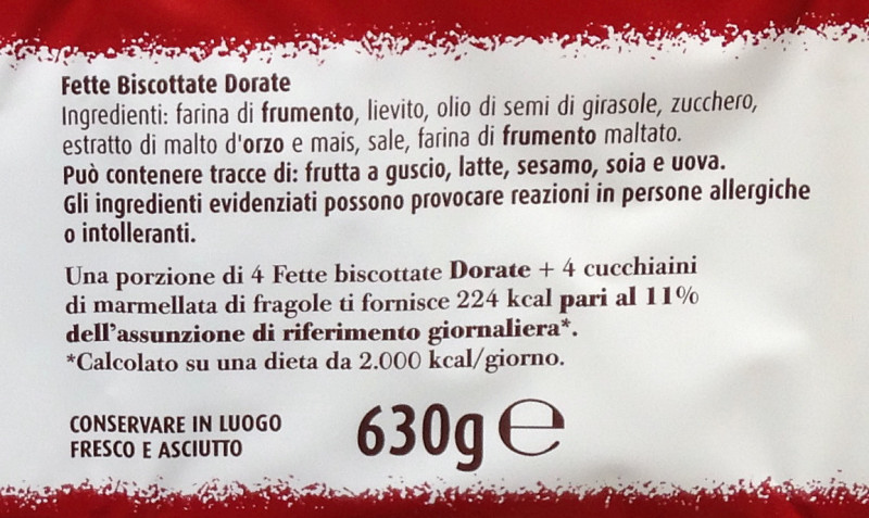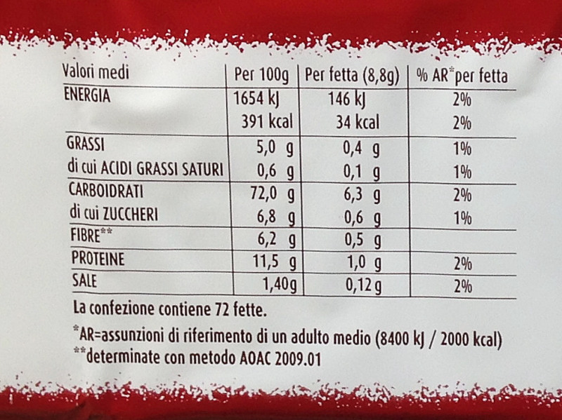 Barcode EAN:   8076809512107 Energy kcal/100g:   391 Satured Fat (per 100g)g:   0.6 Sugar into Carbohydrates (per 100g)g:   6.8 Proteines (per 100g)g:   11.5 Calcium CA/ mg (per 100g)g:   Gluten:   Production type:   Made in:   Italy Price €:   Bought here:   Last update:   2017-01-08 19:36:25 | Brand:   Fat (per 100g)g:   5 Carbohydrates (per 100g)g:   72 Fiber (per 100g)g:   6.2 Salt - Sodium (per 100g)g:   1.4 Ingredients (Indicative):   |