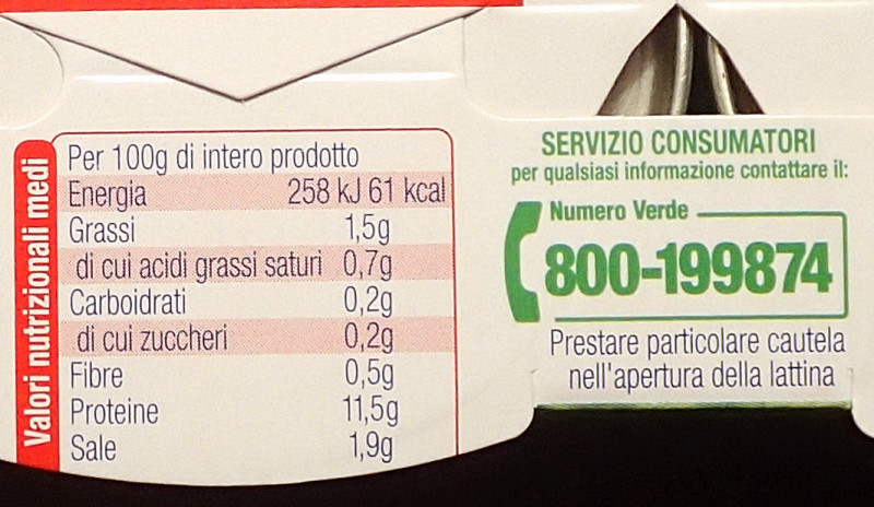 Barcode EAN:   7622300328276 Energy kcal/100g:   61 Satured Fat (per 100g)g:   0.7 Sugar into Carbohydrates (per 100g)g:   0.2 Proteines (per 100g)g:   11.5 Calcium CA/ mg (per 100g)g:   Gluten:   Production type:   Made in:   Italy Price €:   Bought here:   Last update:   2017-01-09 16:24:21 | Brand:   Fat (per 100g)g:   1.5 Carbohydrates (per 100g)g:   0.2 Fiber (per 100g)g:   0.5 Salt - Sodium (per 100g)g:   1.9 Ingredients (Indicative):   |