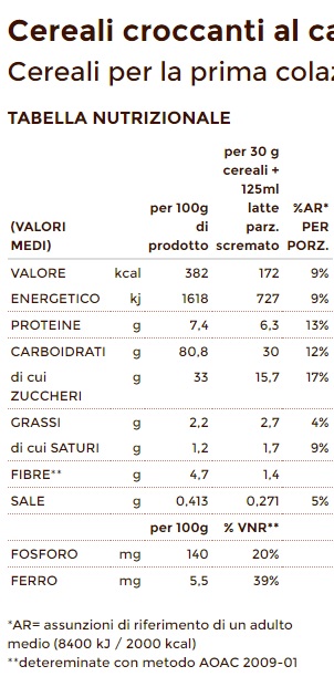 Barcode EAN:   8076809536523 Energy kcal/100g:   382 Satured Fat (per 100g)g:   1.2 Sugar into Carbohydrates (per 100g)g:   33 Proteines (per 100g)g:   7.4 Calcium CA/ mg (per 100g)g:   Gluten:   Production type:   Made in:   Italy Price €:   Bought here:   Last update:   2017-01-15 18:36:21 | Brand:   Fat (per 100g)g:   2.2 Carbohydrates (per 100g)g:   80.8 Fiber (per 100g)g:   4.7 Salt - Sodium (per 100g)g:   0.413 Ingredients (Indicative):   |