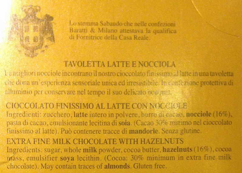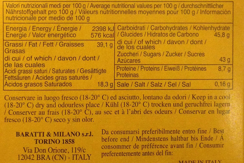Barcode EAN:   8007692042006 Energy kcal/100g:   576 Satured Fat (per 100g)g:   18.3 Sugar into Carbohydrates (per 100g)g:   43 Proteines (per 100g)g:   8.7 Calcium CA/ mg (per 100g)g:   Gluten:   Production type:   Made in:   Italy Price €:   Bought here:   Last update:   2017-01-22 18:07:24 | Brand:   Fat (per 100g)g:   39.1 Carbohydrates (per 100g)g:   45.8 Fiber (per 100g)g:   Salt - Sodium (per 100g)g:   0.16 Ingredients (Indicative):   |