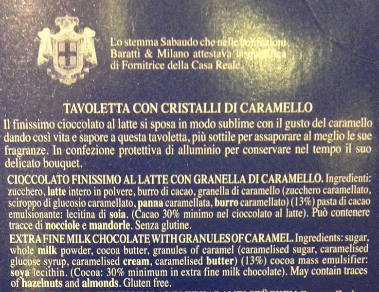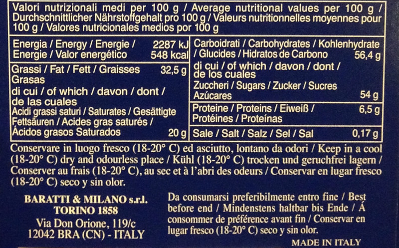 Barcode EAN:   8007692042235 Energy kcal/100g:   548 Satured Fat (per 100g)g:   20 Sugar into Carbohydrates (per 100g)g:   54 Proteines (per 100g)g:   5.5 Calcium CA/ mg (per 100g)g:   Gluten:   Production type:   Made in:   Italy Price €:   Bought here:   Last update:   2017-01-22 18:45:14 | Brand:   Fat (per 100g)g:   32.5 Carbohydrates (per 100g)g:   56.4 Fiber (per 100g)g:   Salt - Sodium (per 100g)g:   0.17 Ingredients (Indicative):   |