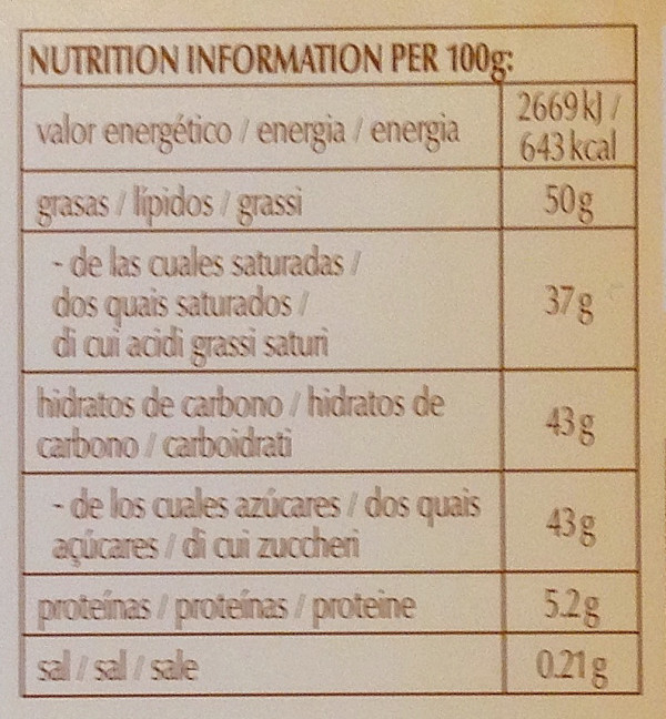 Barcode EAN:   7610400081405 Energy kcal/100g:   643 Satured Fat (per 100g)g:   37 Sugar into Carbohydrates (per 100g)g:   43 Proteines (per 100g)g:   5.2 Calcium CA/ mg (per 100g)g:   Gluten:   Production type:   Made in:   Price €:   Bought here:   Last update:   2017-01-22 19:18:28 | Brand:   Fat (per 100g)g:   50 Carbohydrates (per 100g)g:   43 Fiber (per 100g)g:   Salt - Sodium (per 100g)g:   0.21 Ingredients (Indicative):   |