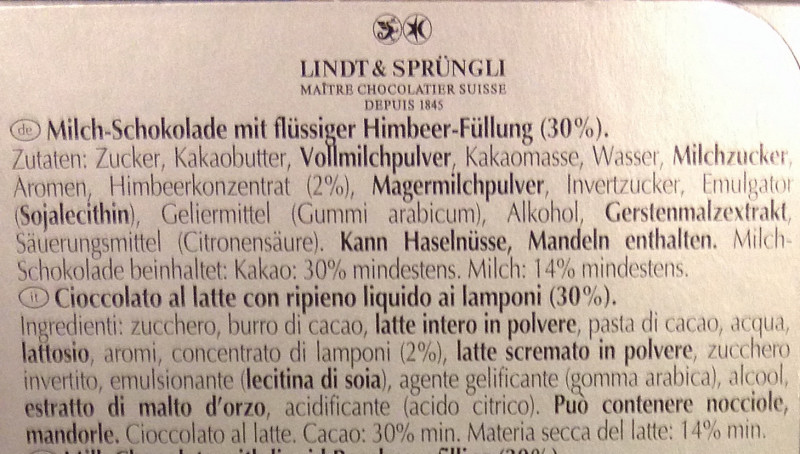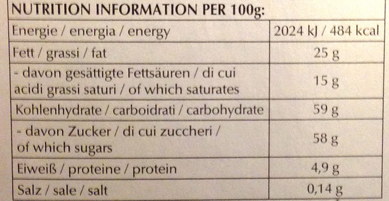 Barcode EAN:   7610400013086 Energy kcal/100g:   484 Satured Fat (per 100g)g:   15 Sugar into Carbohydrates (per 100g)g:   58 Proteines (per 100g)g:   4.9 Calcium CA/ mg (per 100g)g:   Gluten:   Production type:   Made in:   Switzerland Price €:   Bought here:   Last update:   2017-01-22 20:16:01 | Brand:   Fat (per 100g)g:   25 Carbohydrates (per 100g)g:   59 Fiber (per 100g)g:   Salt - Sodium (per 100g)g:   0.14 Ingredients (Indicative):   |