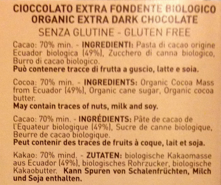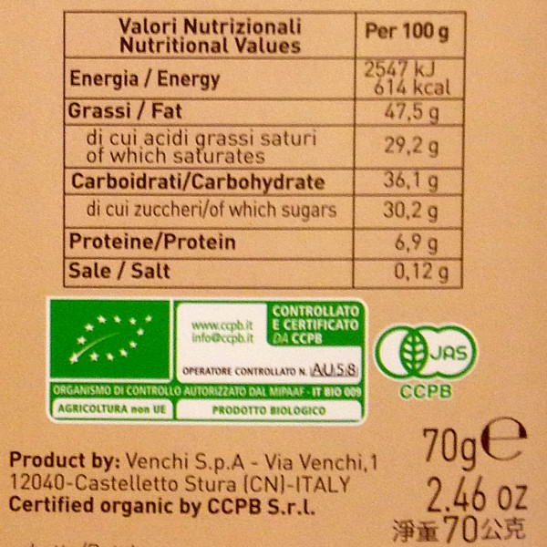 Barcode EAN:   8002996973247 Energy kcal/100g:   614 Satured Fat (per 100g)g:   29.2 Sugar into Carbohydrates (per 100g)g:   30.2 Proteines (per 100g)g:   6.9 Calcium CA/ mg (per 100g)g:   Gluten:   Production type:   Made in:   Italy Price €:   Last update:   2017-01-23 18:09:20 | Brand:   Fat (per 100g)g:   47.5 Carbohydrates (per 100g)g:   36.1 Fiber (per 100g)g:   Salt - Sodium (per 100g)g:   0.12 Ingredients (Indicative):   Bought here:   |