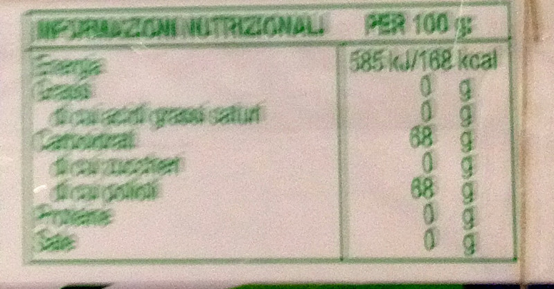 Barcode EAN:   80825401 Energy kcal/100g:   168 Satured Fat (per 100g)g:   Sugar into Carbohydrates (per 100g)g:   68 Proteines (per 100g)g:   Calcium CA/ mg (per 100g)g:   Gluten:   Production type:   Made in:   Italy Price €:   Bought here:   Last update:   2017-01-30 21:26:39 | Brand:   Fat (per 100g)g:   Carbohydrates (per 100g)g:   68 Fiber (per 100g)g:   Salt - Sodium (per 100g)g:   Ingredients (Indicative):   |