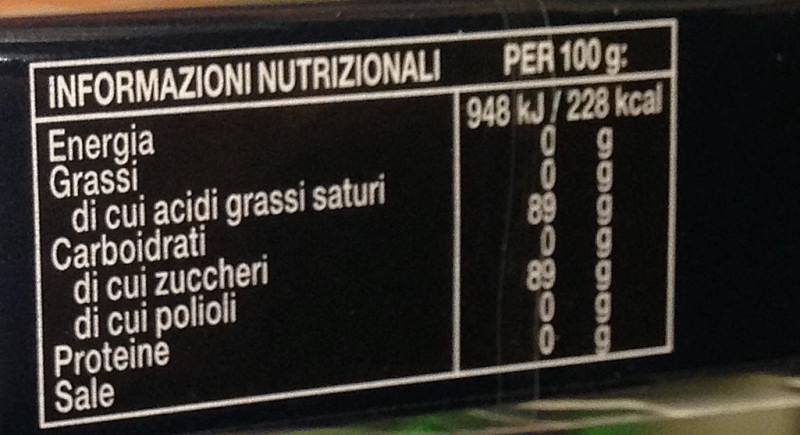 Barcode EAN:   80919865 Energy kcal/100g:   228 Satured Fat (per 100g)g:   Sugar into Carbohydrates (per 100g)g:   Proteines (per 100g)g:   Calcium CA/ mg (per 100g)g:   Gluten:   Production type:   Made in:   Italy Price €:   Bought here:   Last update:   2017-01-31 18:27:48 | Brand:   Fat (per 100g)g:   Carbohydrates (per 100g)g:   89 Fiber (per 100g)g:   Salt - Sodium (per 100g)g:   Ingredients (Indicative):   |