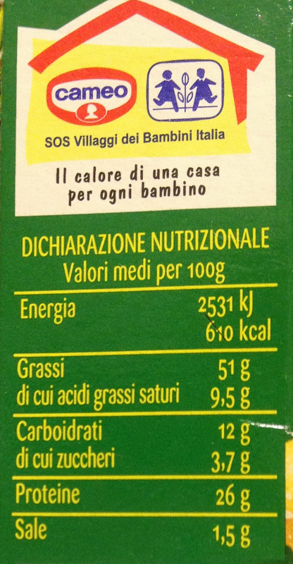Barcode EAN:   8003000030215 Energy kcal/100g:   610 Satured Fat (per 100g)g:   9.5 Sugar into Carbohydrates (per 100g)g:   3.7 Proteines (per 100g)g:   26 Calcium CA/ mg (per 100g)g:   Gluten:   Production type:   Made in:   Italy Price €:   Bought here:   Last update:   2017-02-01 19:57:09 | Brand:   Fat (per 100g)g:   51 Carbohydrates (per 100g)g:   12 Fiber (per 100g)g:   Salt - Sodium (per 100g)g:   1.5 Ingredients (Indicative):   |