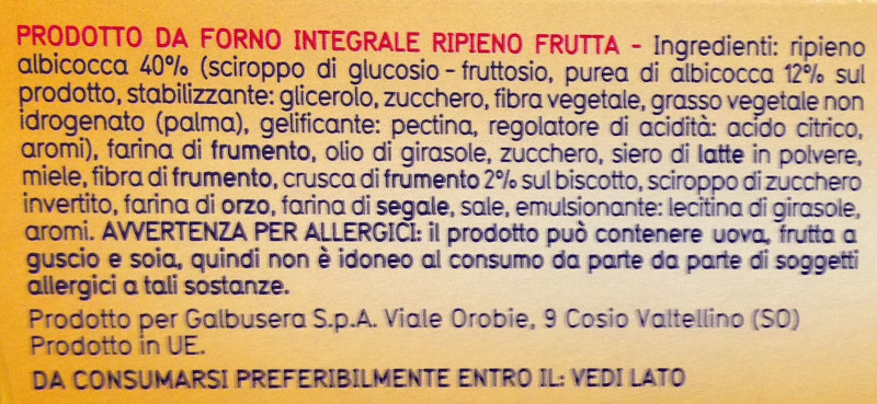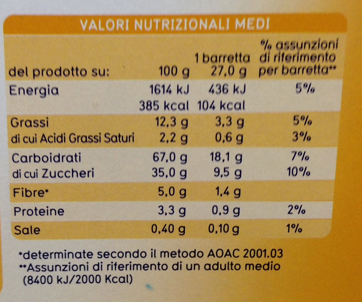 Barcode EAN:   8002190007083 Energy kcal/100g:   385 Satured Fat (per 100g)g:   2.2 Sugar into Carbohydrates (per 100g)g:   35 Proteines (per 100g)g:   3.3 Calcium CA/ mg (per 100g)g:   Gluten:   Production type:   Made in:   Italy Price €:   Bought here:   Last update:   2017-02-02 07:20:29 | Brand:   Fat (per 100g)g:   12.3 Carbohydrates (per 100g)g:   67 Fiber (per 100g)g:   5 Salt - Sodium (per 100g)g:   0.4 Ingredients (Indicative):   |