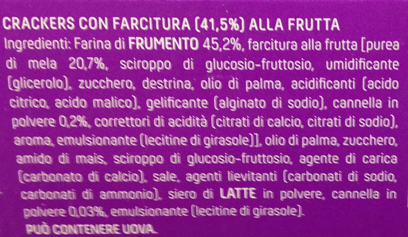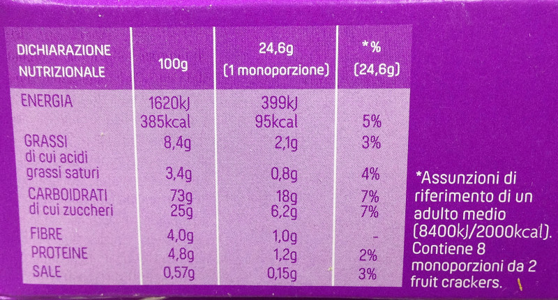 Barcode EAN:   8000090600786 Energy kcal/100g:   385 Satured Fat (per 100g)g:   3.4 Sugar into Carbohydrates (per 100g)g:   25 Proteines (per 100g)g:   4.8 Calcium CA/ mg (per 100g)g:   Gluten:   Production type:   Made in:   Italy Price €:   Bought here:   Last update:   2017-02-02 07:40:02 | Brand:   Fat (per 100g)g:   8.4 Carbohydrates (per 100g)g:   73 Fiber (per 100g)g:   4 Salt - Sodium (per 100g)g:   0.57 Ingredients (Indicative):   |