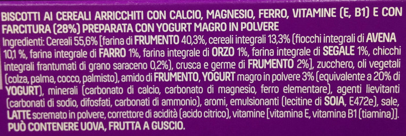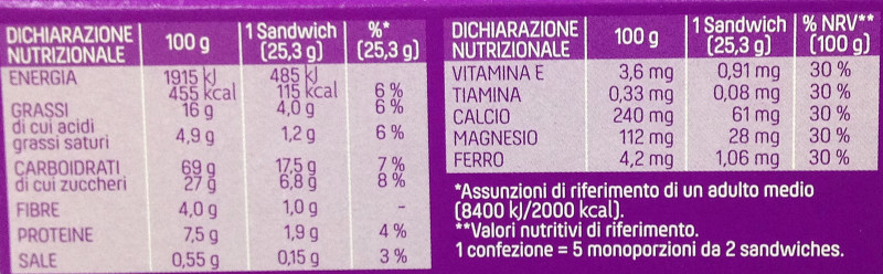 Barcode EAN:   8000090600472 Energy kcal/100g:   455 Satured Fat (per 100g)g:   4.9 Sugar into Carbohydrates (per 100g)g:   27 Proteines (per 100g)g:   7.5 Calcium CA/ mg (per 100g)g:   Gluten:   Production type:   Made in:   Italy Price €:   Bought here:   Last update:   2017-02-02 18:15:40 | Brand:   Fat (per 100g)g:   16 Carbohydrates (per 100g)g:   69 Fiber (per 100g)g:   4 Salt - Sodium (per 100g)g:   0.55 Ingredients (Indicative):   |