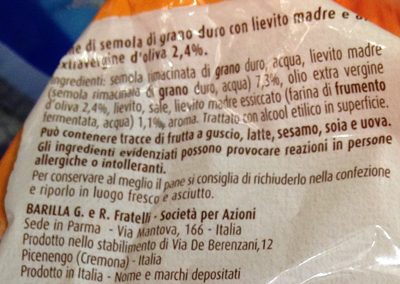Barcode EAN:   8076809540728 Energy kcal/100g:   251 Satured Fat (per 100g)g:   0.6 Sugar into Carbohydrates (per 100g)g:   6.5 Proteines (per 100g)g:   9 Calcium CA/ mg (per 100g)g:   Gluten:   Production type:   Made in:   Italy Price €:   Bought here:   Last update:   2017-02-05 21:26:49 | Brand:   Fat (per 100g)g:   3.5 Carbohydrates (per 100g)g:   43.1 Fiber (per 100g)g:   5.5 Salt - Sodium (per 100g)g:   1.25 Ingredients (Indicative):   |