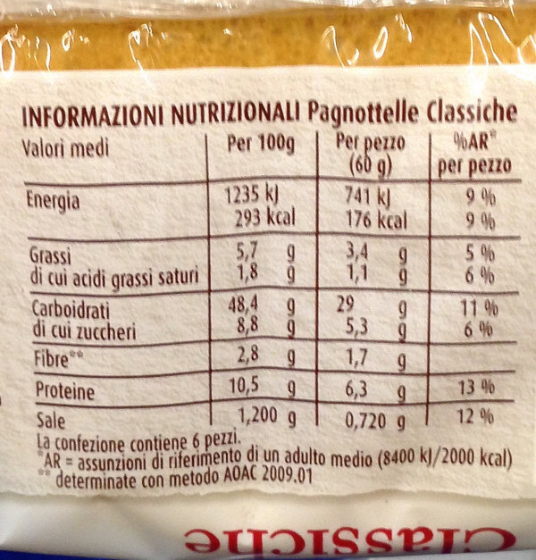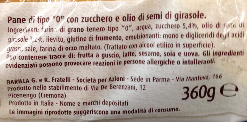 Barcode EAN:   8076809519359 Energy kcal/100g:   293 Satured Fat (per 100g)g:   1.8 Sugar into Carbohydrates (per 100g)g:   8.8 Proteines (per 100g)g:   10.5 Calcium CA/ mg (per 100g)g:   Gluten:   Production type:   Made in:   Italy Price €:   Bought here:   Last update:   2017-02-08 16:51:55 | Brand:   Fat (per 100g)g:   5.7 Carbohydrates (per 100g)g:   48.4 Fiber (per 100g)g:   2.8 Salt - Sodium (per 100g)g:   1.2 Ingredients (Indicative):   |