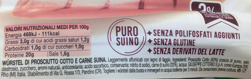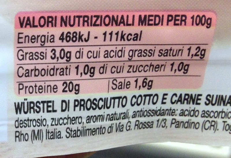 Barcode EAN:   8008410358119 Energy kcal/100g:   111 Satured Fat (per 100g)g:   1.2 Sugar into Carbohydrates (per 100g)g:   1 Proteines (per 100g)g:   20 Calcium CA/ mg (per 100g)g:   Gluten:   Production type:   Made in:   Italy Price €:   Bought here:   Last update:   2017-02-08 17:14:12 | Brand:   Fat (per 100g)g:   3 Carbohydrates (per 100g)g:   1 Fiber (per 100g)g:   Salt - Sodium (per 100g)g:   1.6 Ingredients (Indicative):   |