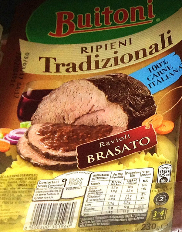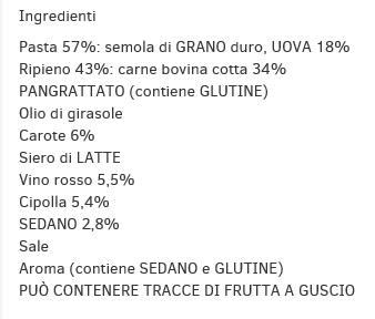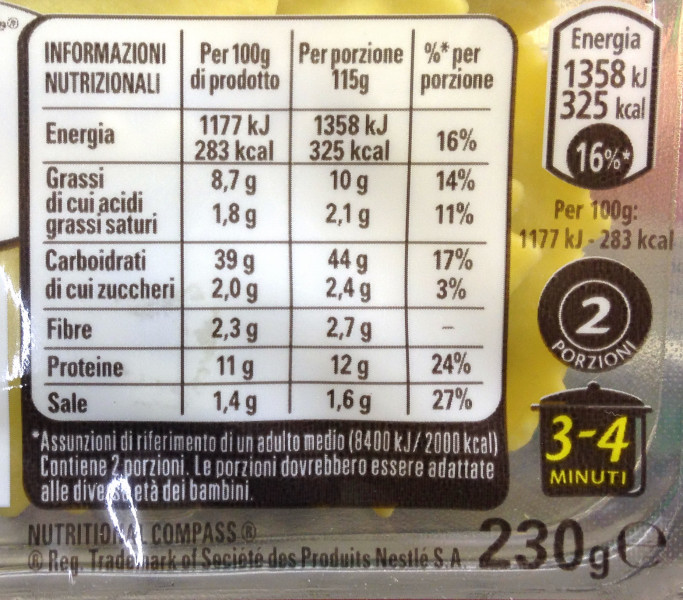 Barcode EAN:   8000300301960 Energy kcal/100g:   283 Satured Fat (per 100g)g:   1.8 Sugar into Carbohydrates (per 100g)g:   2 Proteines (per 100g)g:   11 Calcium CA/ mg (per 100g)g:   Gluten:   Production type:   Made in:   Italy Price €:   Bought here:   Cooking time - min.:   4 Last update:   2017-11-24 17:31:29 | Brand:   Fat (per 100g)g:   8.7 Carbohydrates (per 100g)g:   39 Fiber (per 100g)g:   2.3 Salt - Sodium (per 100g)g:   1.4 Ingredients (Indicative):   |