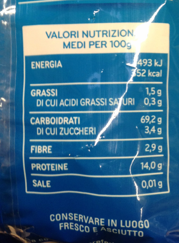 Barcode EAN:   8001250120939 Energy kcal/100g:   352 Satured Fat (per 100g)g:   0.3 Sugar into Carbohydrates (per 100g)g:   3.4 Proteines (per 100g)g:   14 Calcium CA/ mg (per 100g)g:   Gluten:   Made in:   Italy Bought here:   Last update:   2017-02-12 17:26:01 | Brand:   Fat (per 100g)g:   1.5 Carbohydrates (per 100g)g:   69.2 Fiber (per 100g)g:   2.9 Salt - Sodium (per 100g)g:   0.01 Ingredients (Indicative):   Production type:   Price €:   Cooking time - min.:   12 |