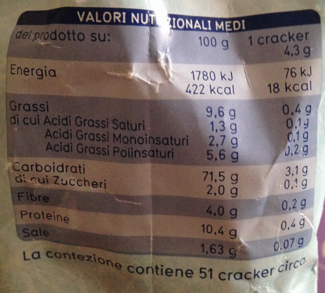 Barcode EAN:   8002190002774 Energy kcal/100g:   422 Satured Fat (per 100g)g:   1.3 Sugar into Carbohydrates (per 100g)g:   2 Proteines (per 100g)g:   10.4 Calcium CA/ mg (per 100g)g:   Gluten:   Production type:   Made in:   Italy Price €:   Bought here:   Last update:   2017-02-15 21:29:49 | Brand:   Fat (per 100g)g:   9.6 Carbohydrates (per 100g)g:   71.5 Fiber (per 100g)g:   4 Salt - Sodium (per 100g)g:   1.63 Ingredients (Indicative):   |