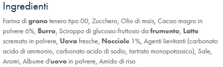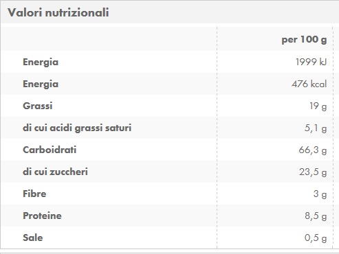 Barcode EAN:   8001120936202 Energy kcal/100g:   476 Satured Fat (per 100g)g:   5.1 Sugar into Carbohydrates (per 100g)g:   23.5 Proteines (per 100g)g:   8.5 Calcium CA/ mg (per 100g)g:   Gluten:   Production type:   Made in:   Italy Price €:   Bought here:   Last update:   2017-02-16 19:50:44 | Brand:   Fat (per 100g)g:   19 Carbohydrates (per 100g)g:   66.3 Fiber (per 100g)g:   3 Salt - Sodium (per 100g)g:   0.5 Ingredients (Indicative):   |