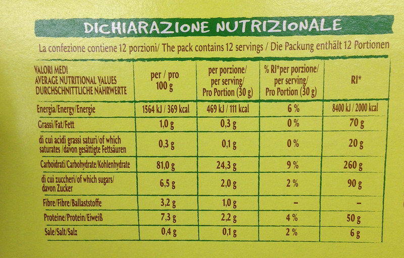 Barcode EAN:   8002895085768 Energy kcal/100g:   369 Satured Fat (per 100g)g:   0.3 Sugar into Carbohydrates (per 100g)g:   6.5 Proteines (per 100g)g:   7.3 Calcium CA/ mg (per 100g)g:   Gluten:   Production type:   Made in:   Italy Price €:   Last update:   2017-02-18 17:38:51 | Brand:   Fat (per 100g)g:   1 Carbohydrates (per 100g)g:   81 Fiber (per 100g)g:   3.2 Salt - Sodium (per 100g)g:   0.4 Ingredients (Indicative):   Bought here:   |