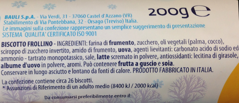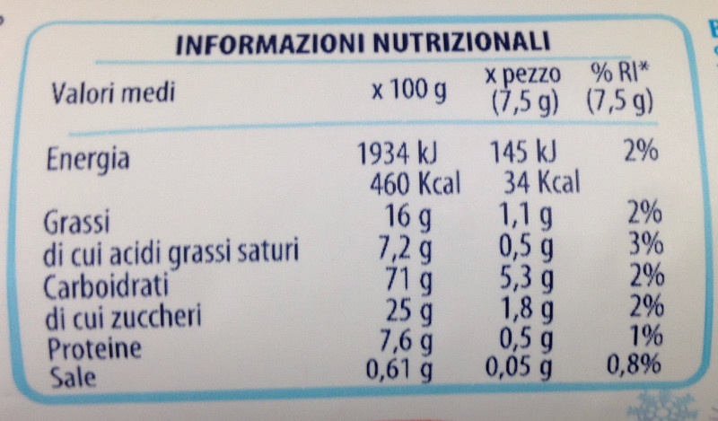 Barcode EAN:   8000605040281 Energy kcal/100g:   460 Satured Fat (per 100g)g:   7.2 Sugar into Carbohydrates (per 100g)g:   25 Proteines (per 100g)g:   7.6 Calcium CA/ mg (per 100g)g:   Gluten:   Production type:   Made in:   Italy Price €:   Bought here:   Last update:   2017-02-18 18:00:24 | Brand:   Fat (per 100g)g:   16 Carbohydrates (per 100g)g:   71 Fiber (per 100g)g:   Salt - Sodium (per 100g)g:   0.61 Ingredients (Indicative):   |