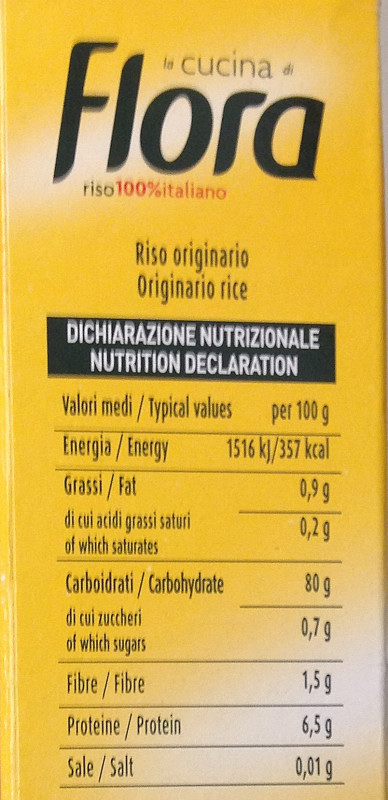 Barcode EAN:   8001200038918 Energy kcal/100g:   357 Satured Fat (per 100g)g:   0.2 Sugar into Carbohydrates (per 100g)g:   0.7 Proteines (per 100g)g:   6.5 Calcium CA/ mg (per 100g)g:   Gluten:   Made in:   Italy Bought here:   Last update:   2017-02-27 16:32:18 | Brand:   Fat (per 100g)g:   0.9 Carbohydrates (per 100g)g:   80 Fiber (per 100g)g:   1.5 Salt - Sodium (per 100g)g:   0.01 Ingredients (Indicative):   Production type:   Price €:   Cooking time - min.:   12 |